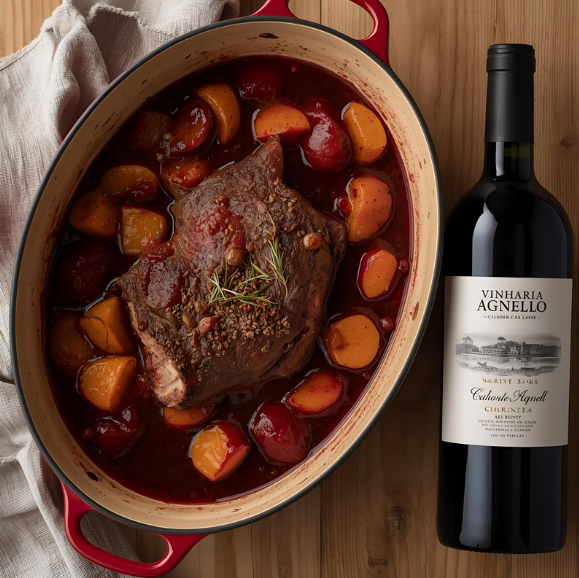 - Volte a carne, adicione vinho tinto suficiente para cobrir parte da carne, deixe reduzir um pouco.